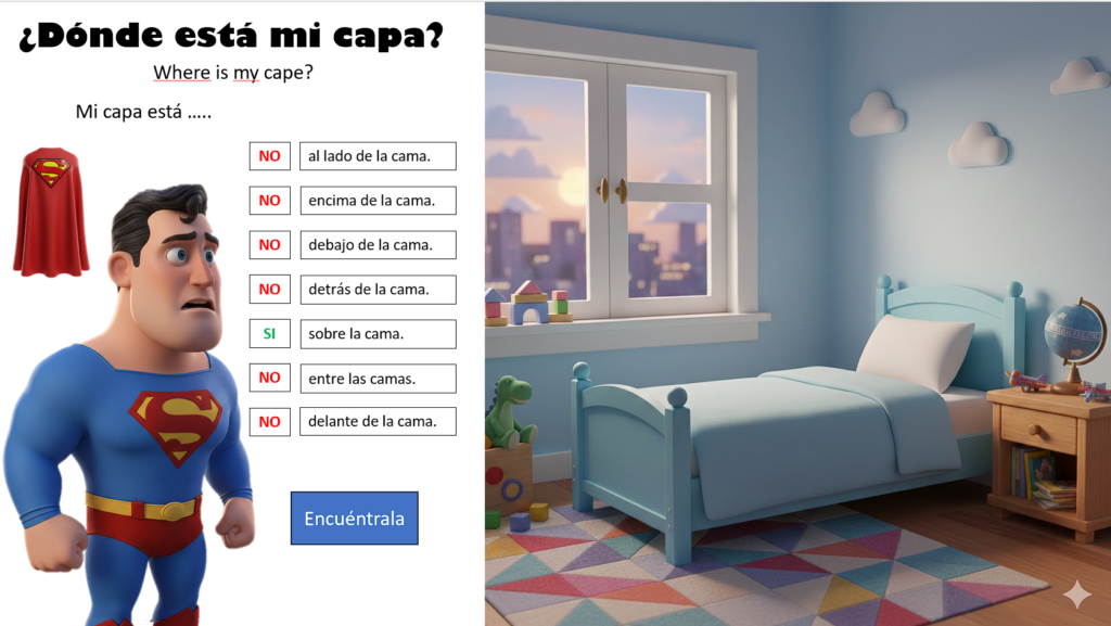 - Juegos de «¿Dónde Están?»: Pon a prueba tu vista y gramática localizando a los héroes en escenarios urbanos y corrigiendo frases de ubicación incorrectas.