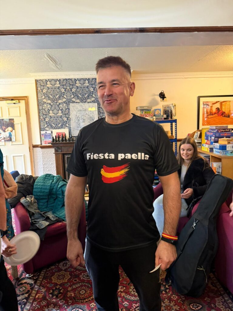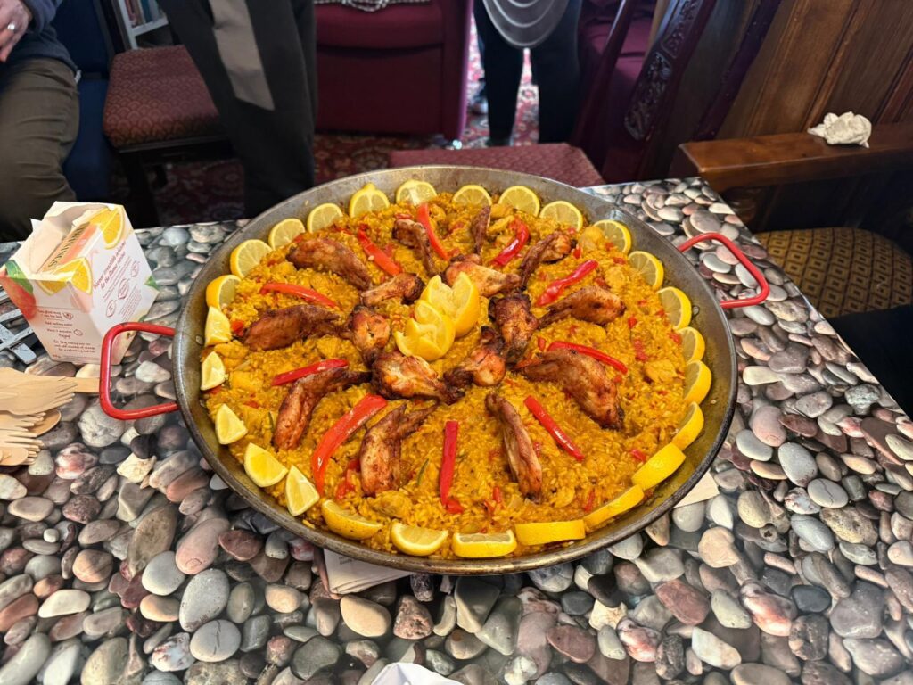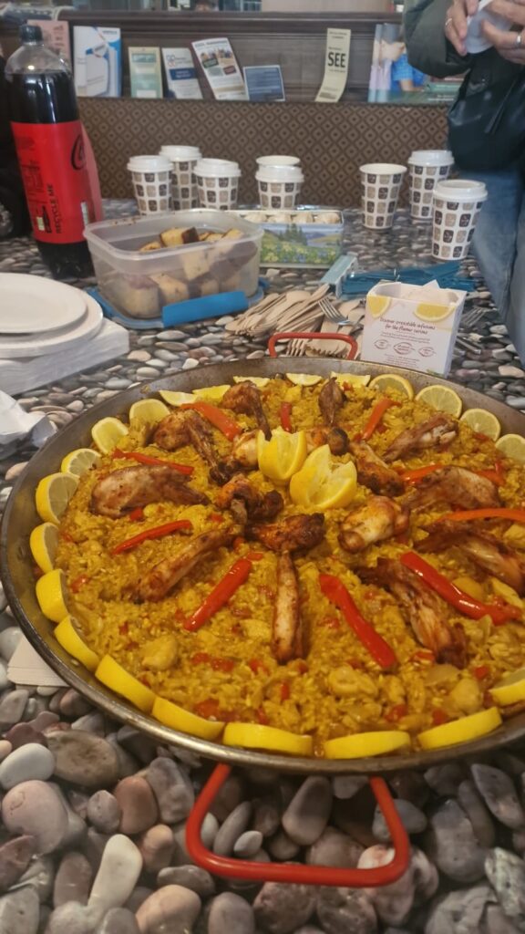 Disfrutamos de una gran variedad de comidas típicas de diferentes países, entre ellas una paella de pollo que preparé con mucho cariño y que fue todo un éxito 🍗🥘 (croquetas, tortilla, cebiche…)